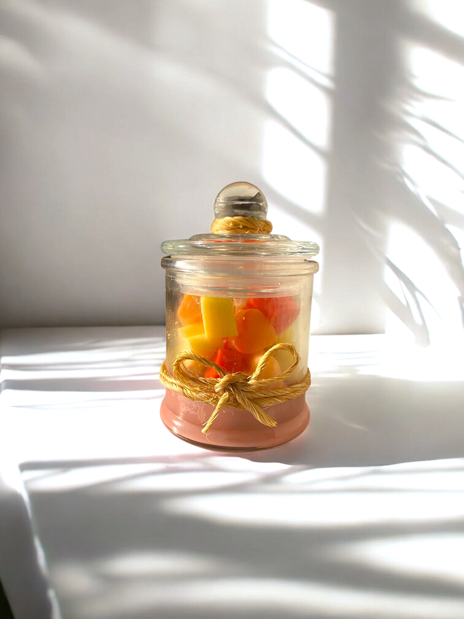 Pequeño tarro de cristal con tapa, con base y corazones aroma Melón.