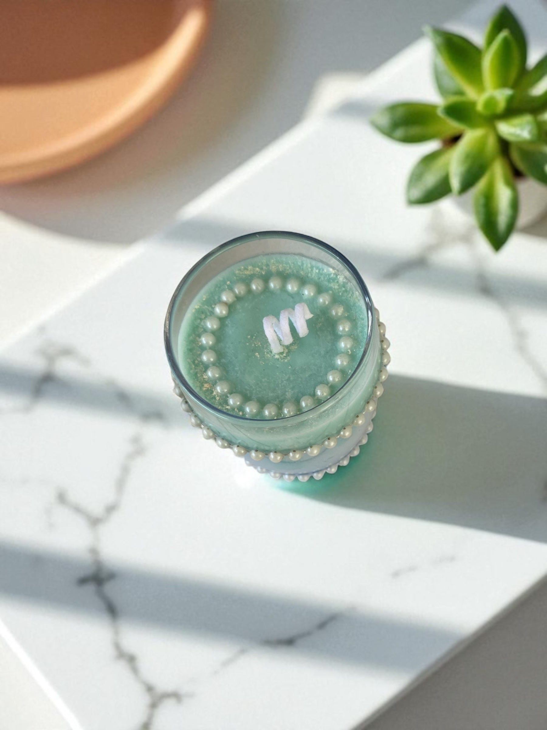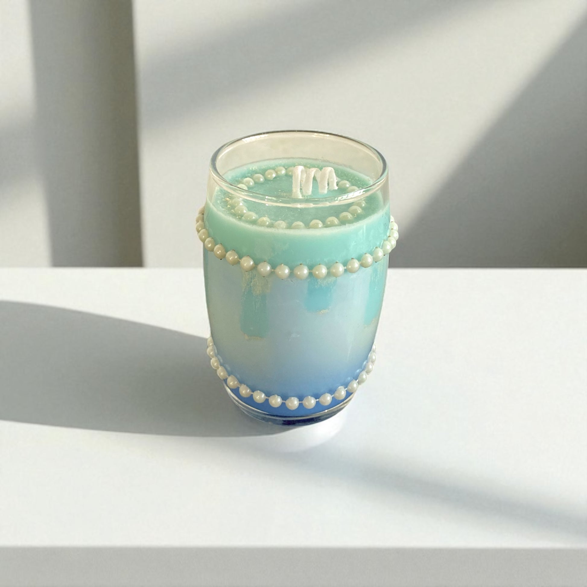 Vela color azul turquesa, con toques de brillo y decoración de perlas. Ligero aroma a Flor de loto.
