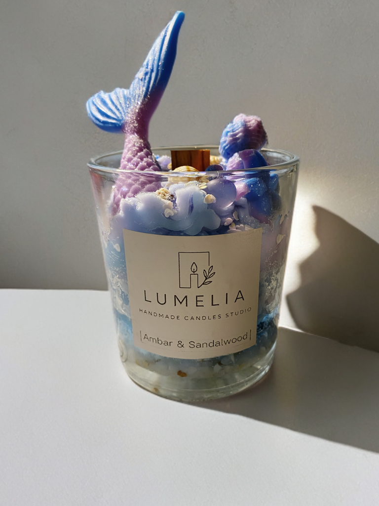 Vela de color azul y lila, con purpurina y detalles de conchas y sirenas. Aroma: Ambar & Sandalwood.